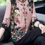 Stylish Pink Stand Collar Print Side Open Silk Shirt Tops Half Sleeve