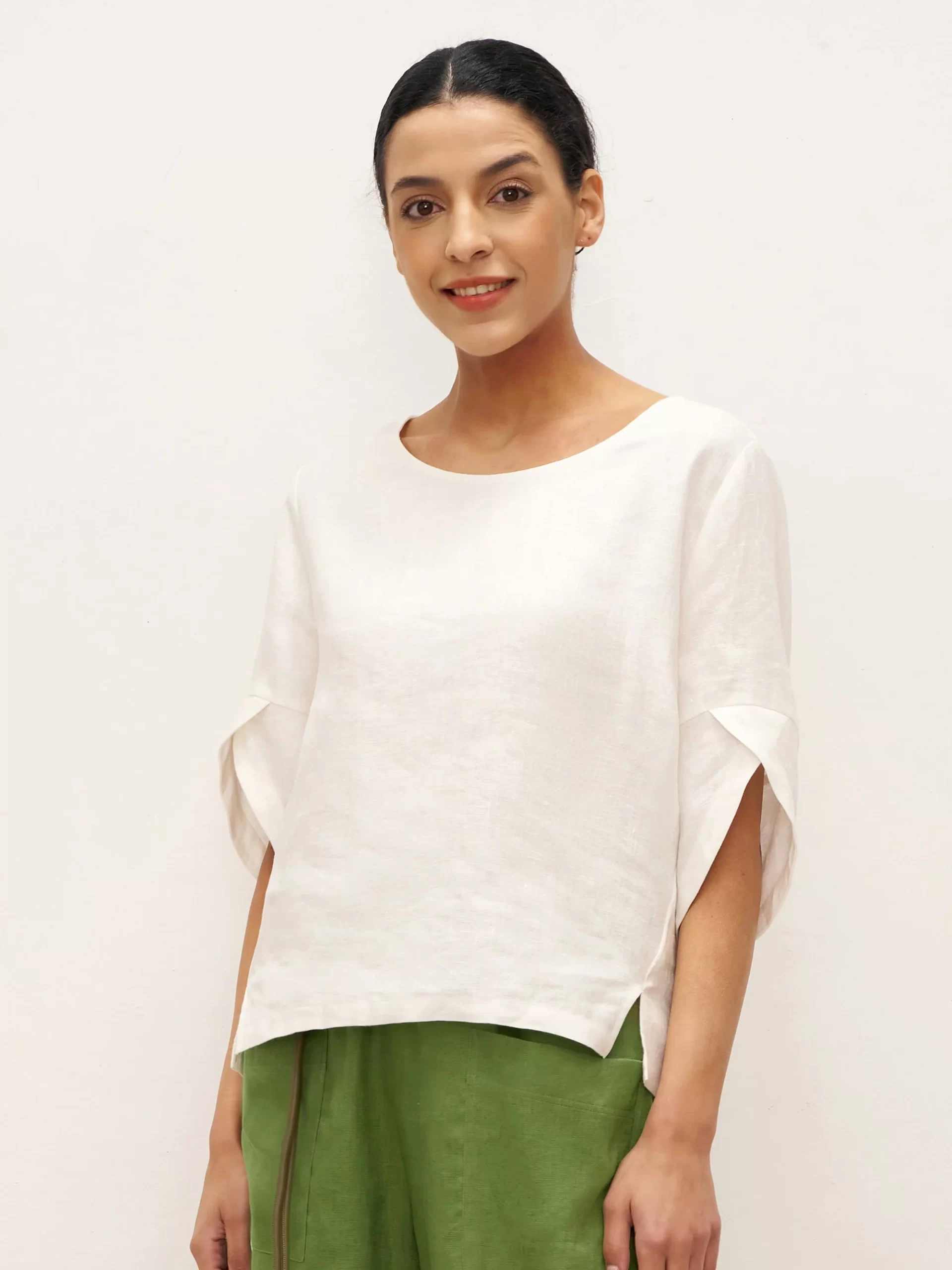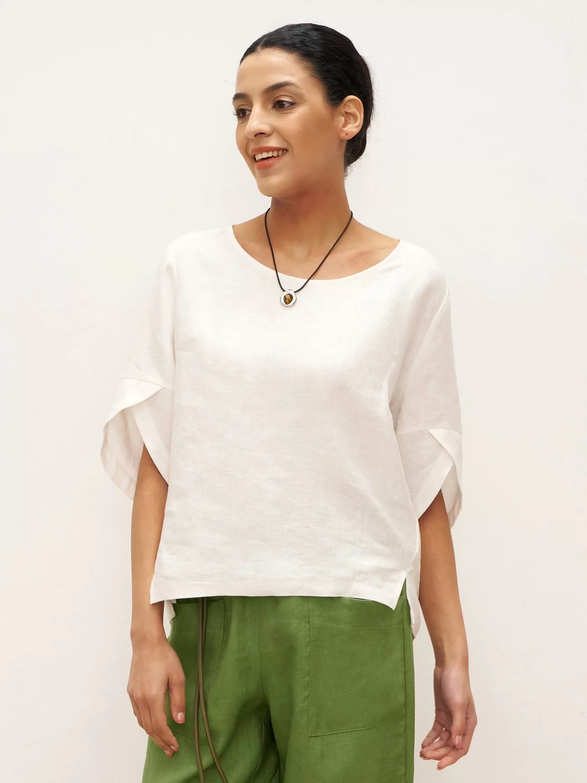 100% Linen Round Neck Petal-Sleeve Pullover LAUREL