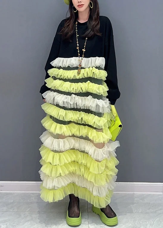 Beautiful Yellow O Neck Tulle Patchwork Fluffy Dresses Long Sleeve