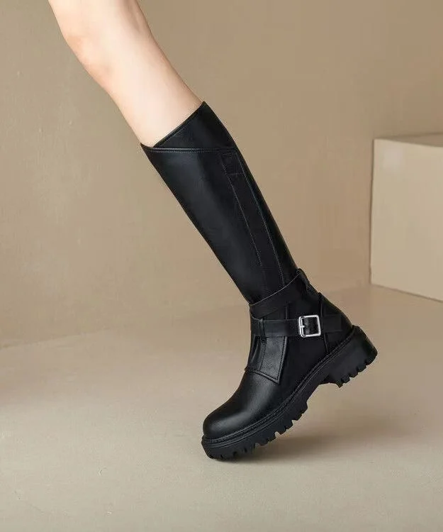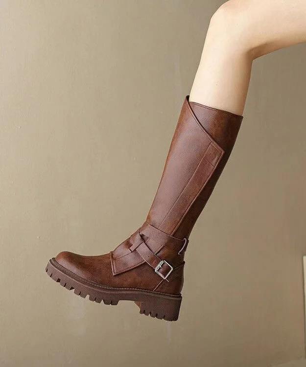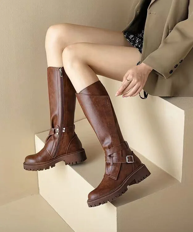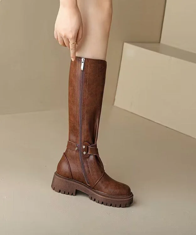 Chic Splicing Chunky Heel Boots Brown Faux Leather Fuzzy Wool Lined