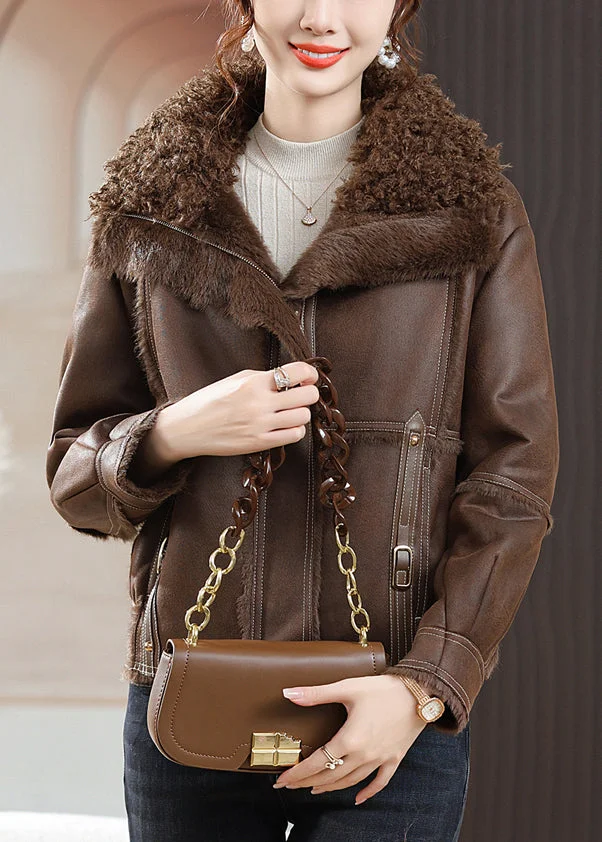 Coffee Zip Up Patchwork Fuzzy Fur Coats Fur Collar Long Sleeve