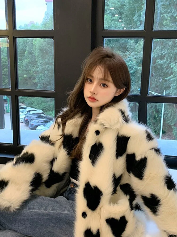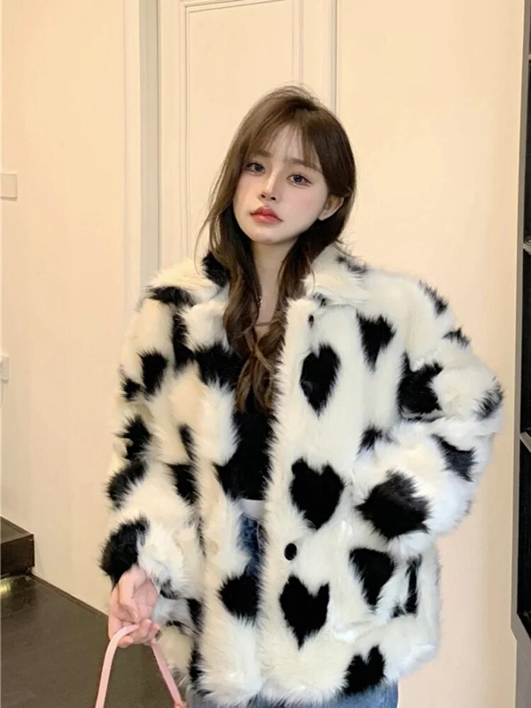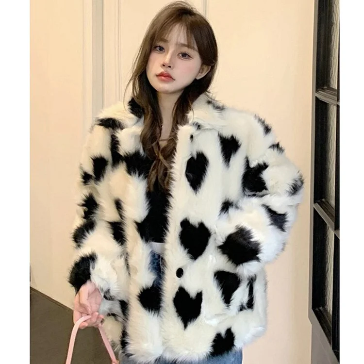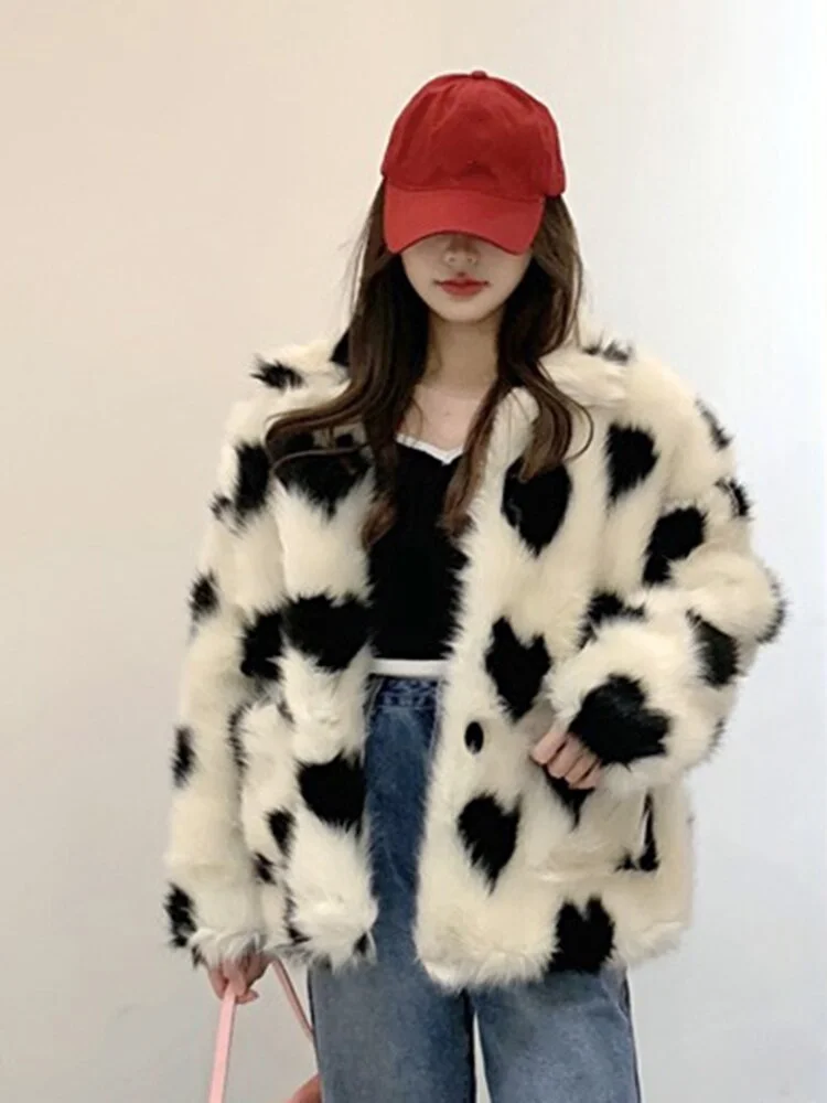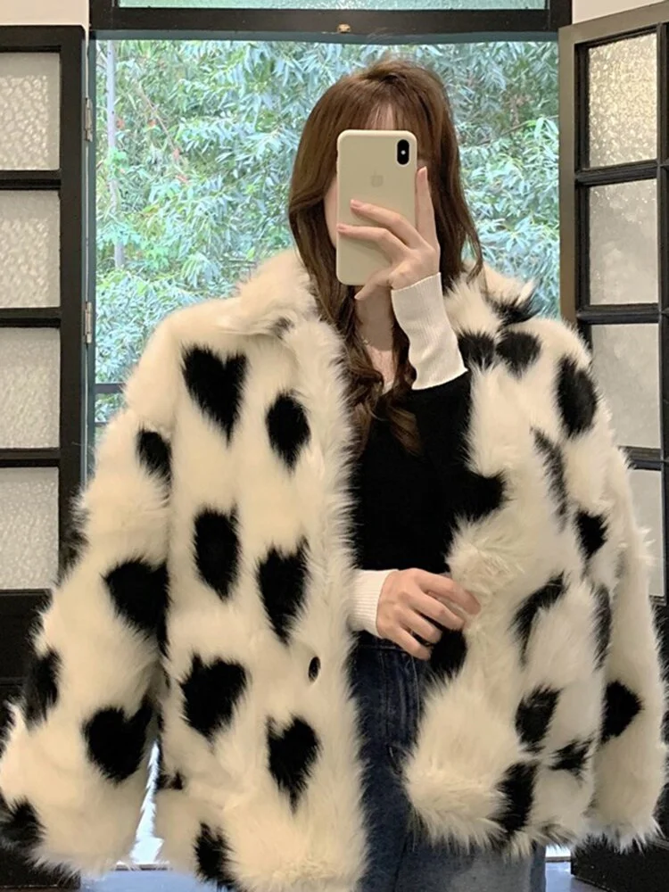 Fluffy Hairy Lapel Contrast Color Heart-shaped Printed Long Sleeve Faux Fur Coat