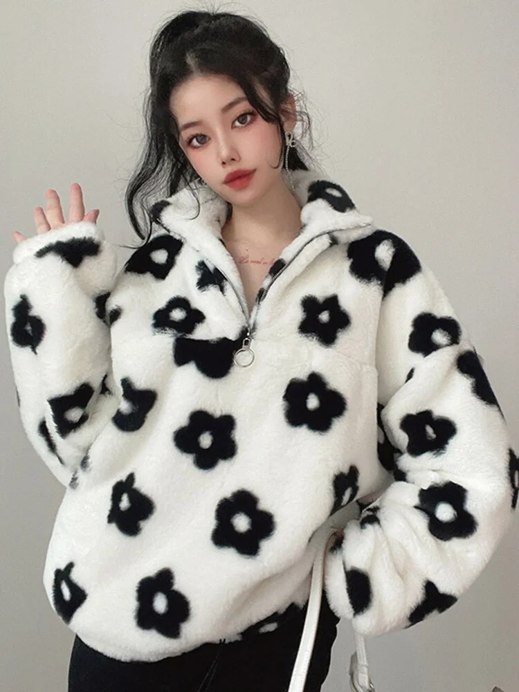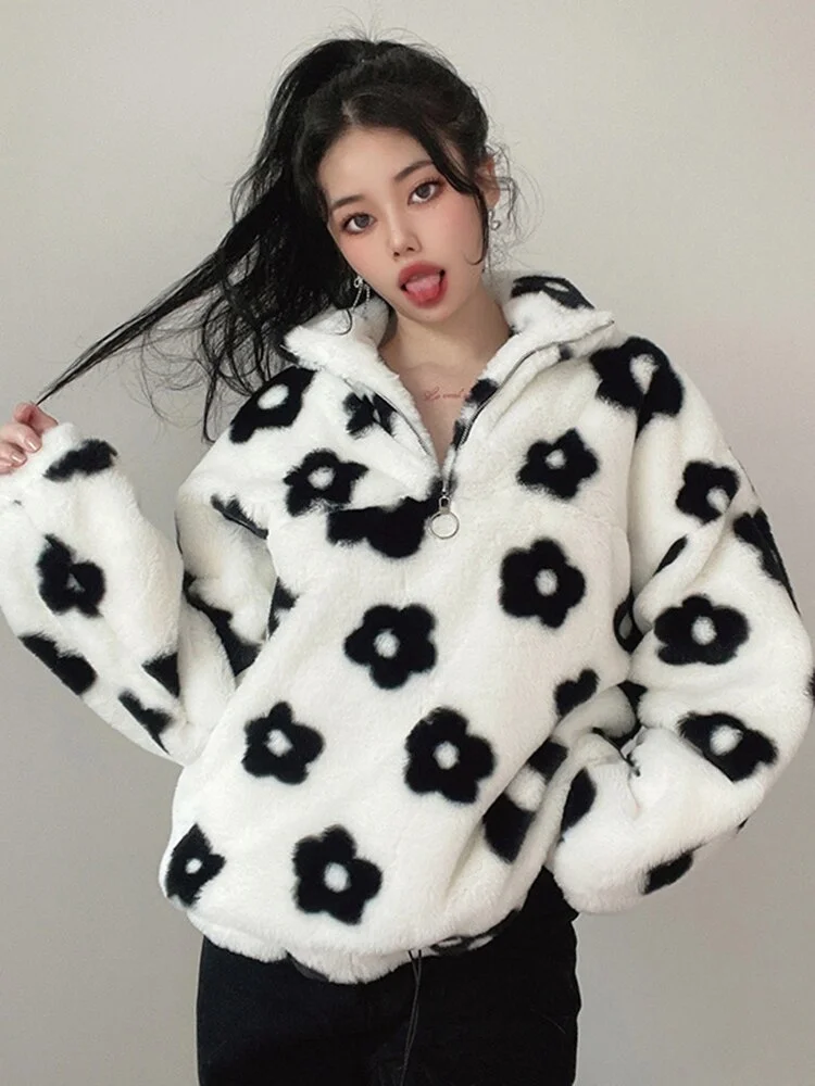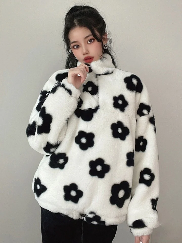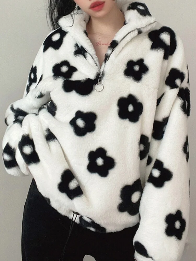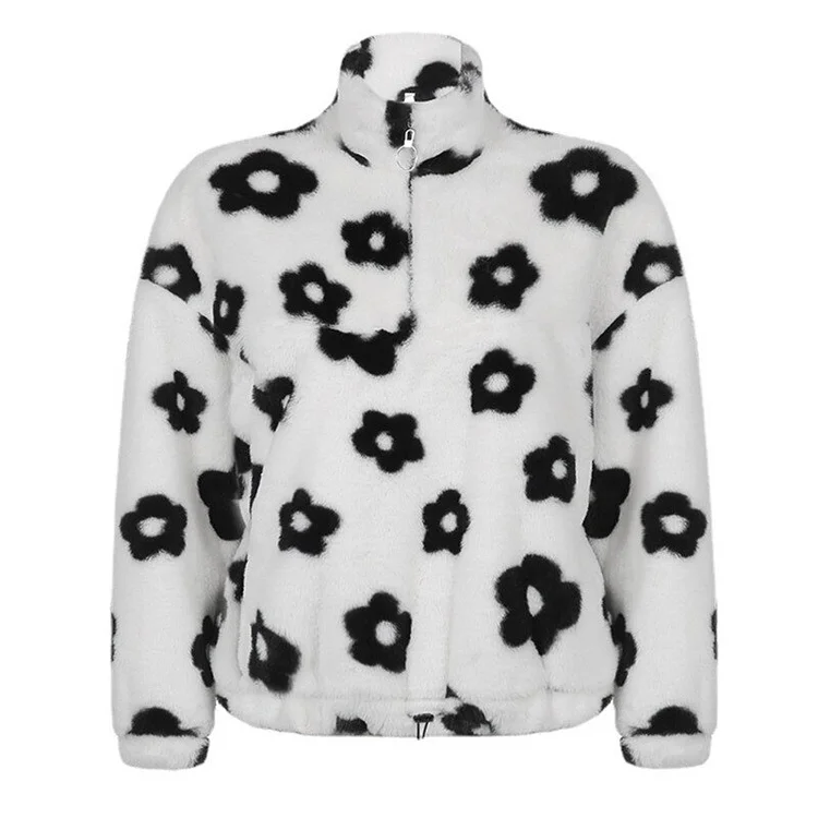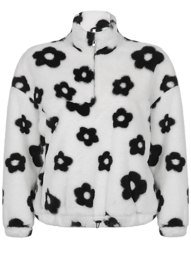 Be the first to review “Soft Hairy Stand Collar With Zipper Flower Shaped Printed Long Sleeve Faux Fur Sweatshirt”