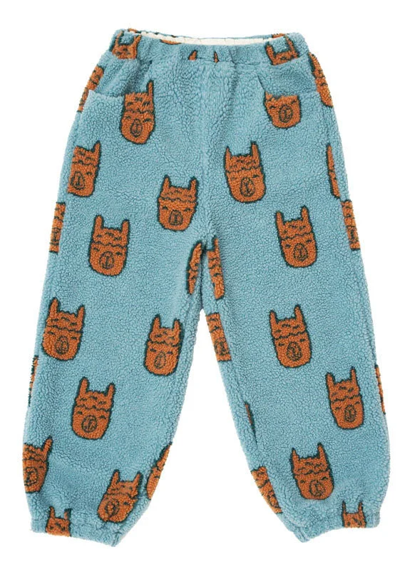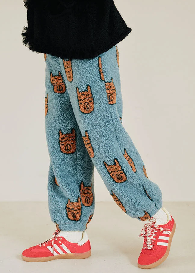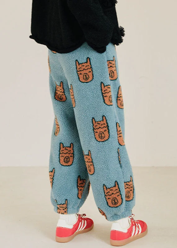 Women Blue Pockets Print Elastic Waist Thick Faux Fur Pants Fall
